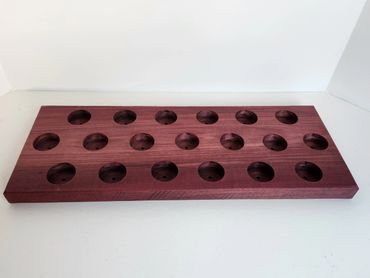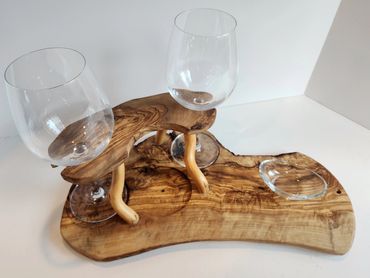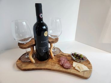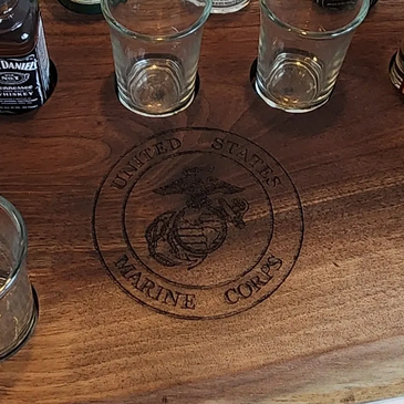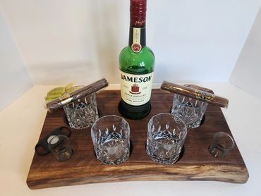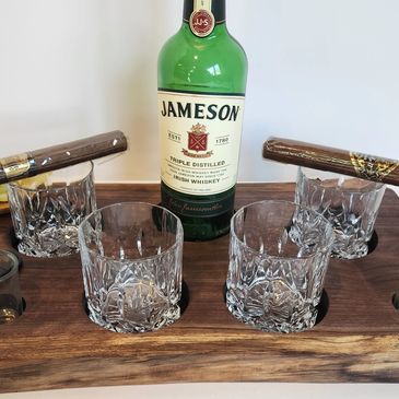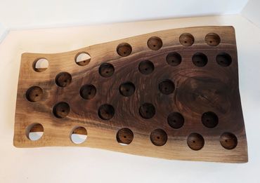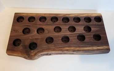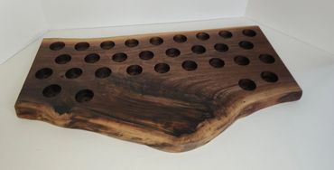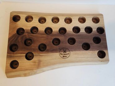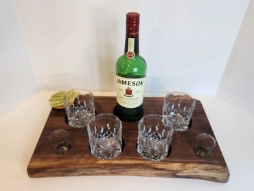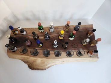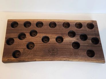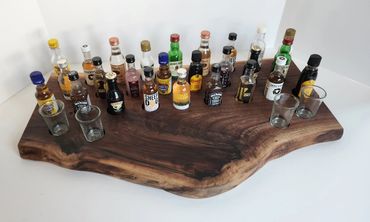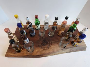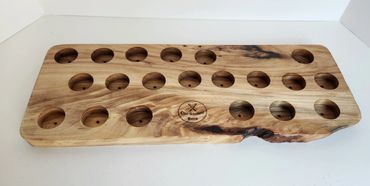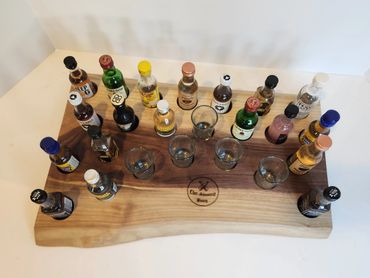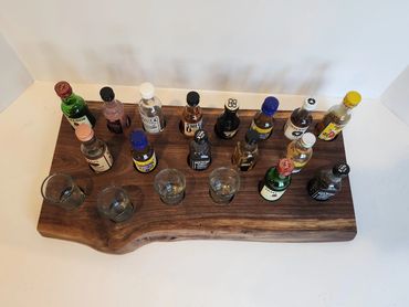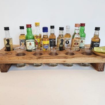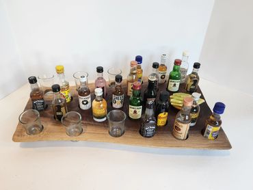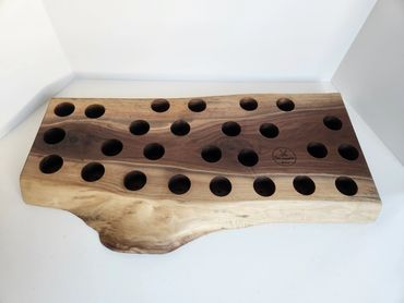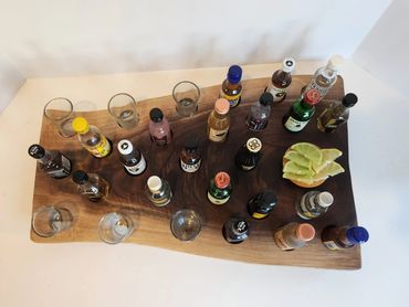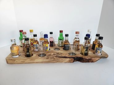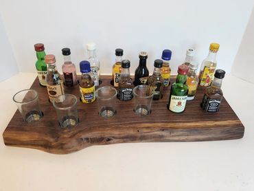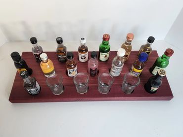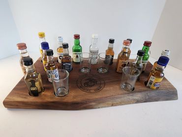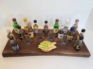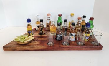 The meat and cheese charcuterie boards have been done to death. You can be a big hit at your next party when you bring a Char-Shooterie board. These boards are all hand made and oiled for long life.. The wood boards include predrilled holes which hold mini bottles and shot glasses. Each board includes a number of glasses to start.